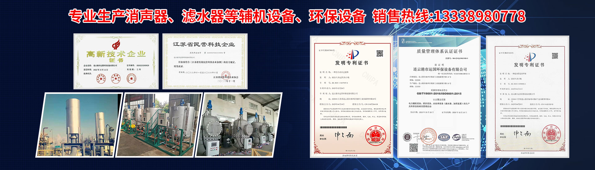 連云港市運國環保設備有限公司一直致力于節能環保設備的研發、生產、銷售和服務一體的專業化制造企業,消聲器廠家,主營安全閥消音器、鍋爐消音器、管道消音器、通風消聲器、鍋爐消聲器、管道消聲器、全自動過濾器、全自動濾水器、自動濾水器、加藥裝置、二次濾網等設備,客戶遍布江蘇、山東、廣東、河北、安徽、福建、河南、遼寧等地,并批量出口東南亞國,在用戶中樹立了良好的口碑。