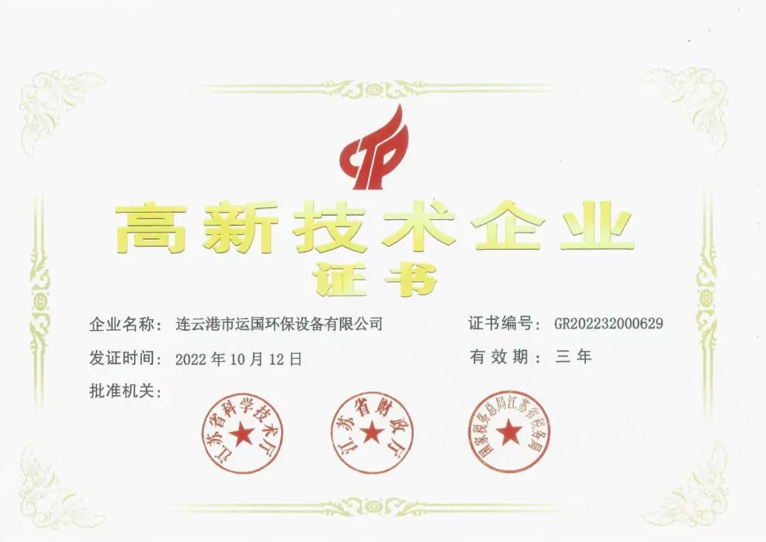 近日,我會(huì)副會(huì)長(zhǎng)單位連云港市運(yùn)國(guó)環(huán)保設(shè)備有限公司收到由江蘇省科學(xué)技術(shù)廳、江蘇省財(cái)政廳、國(guó)家稅務(wù)總局江蘇省稅務(wù)局頒發(fā)的高新技術(shù)企業(yè)證書。