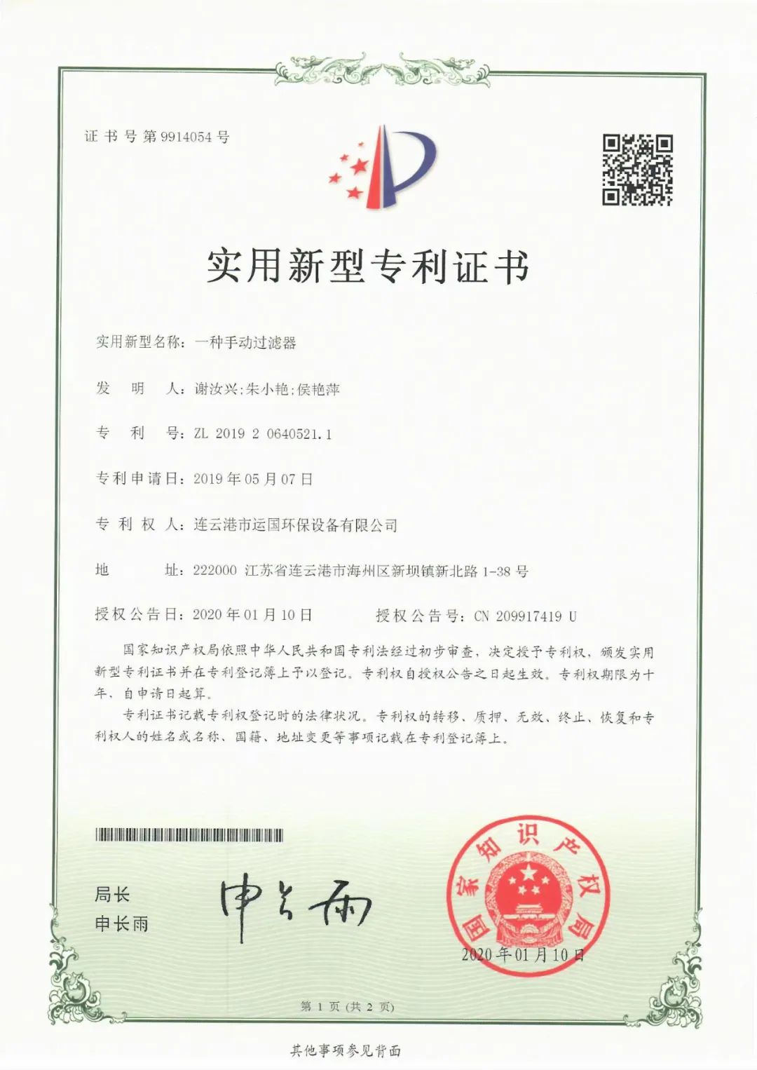 近年來(lái),運(yùn)國(guó)公司在總經(jīng)理謝汝興的帶領(lǐng)下,勇于創(chuàng)新產(chǎn)品,并與江蘇海洋大學(xué)等科研院所合作,先后研發(fā)出“一種不銹鋼復(fù)合式消音器”、“一種手動(dòng)過(guò)濾器”等10多種獲國(guó)家專利、實(shí)用新型專利產(chǎn)品。